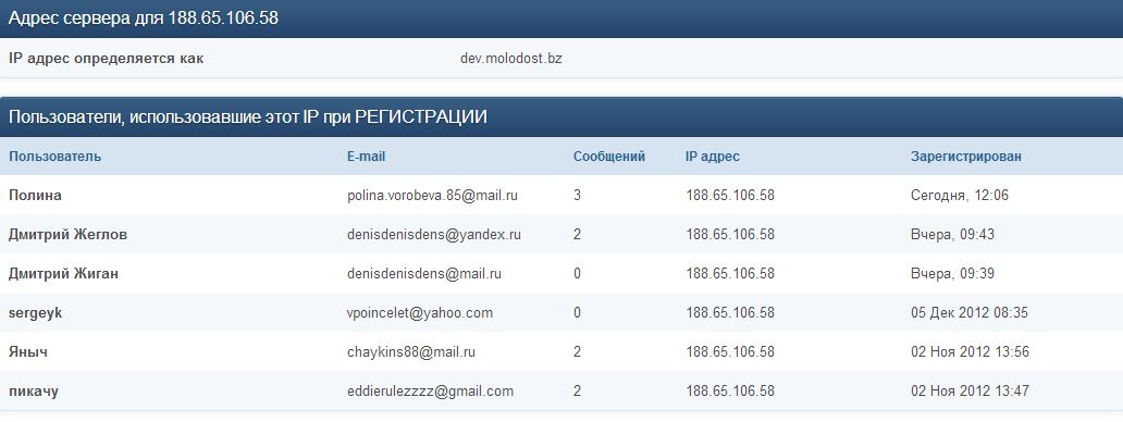 С IP 188.65.106.58, который определяется как: dev.molodost.bz